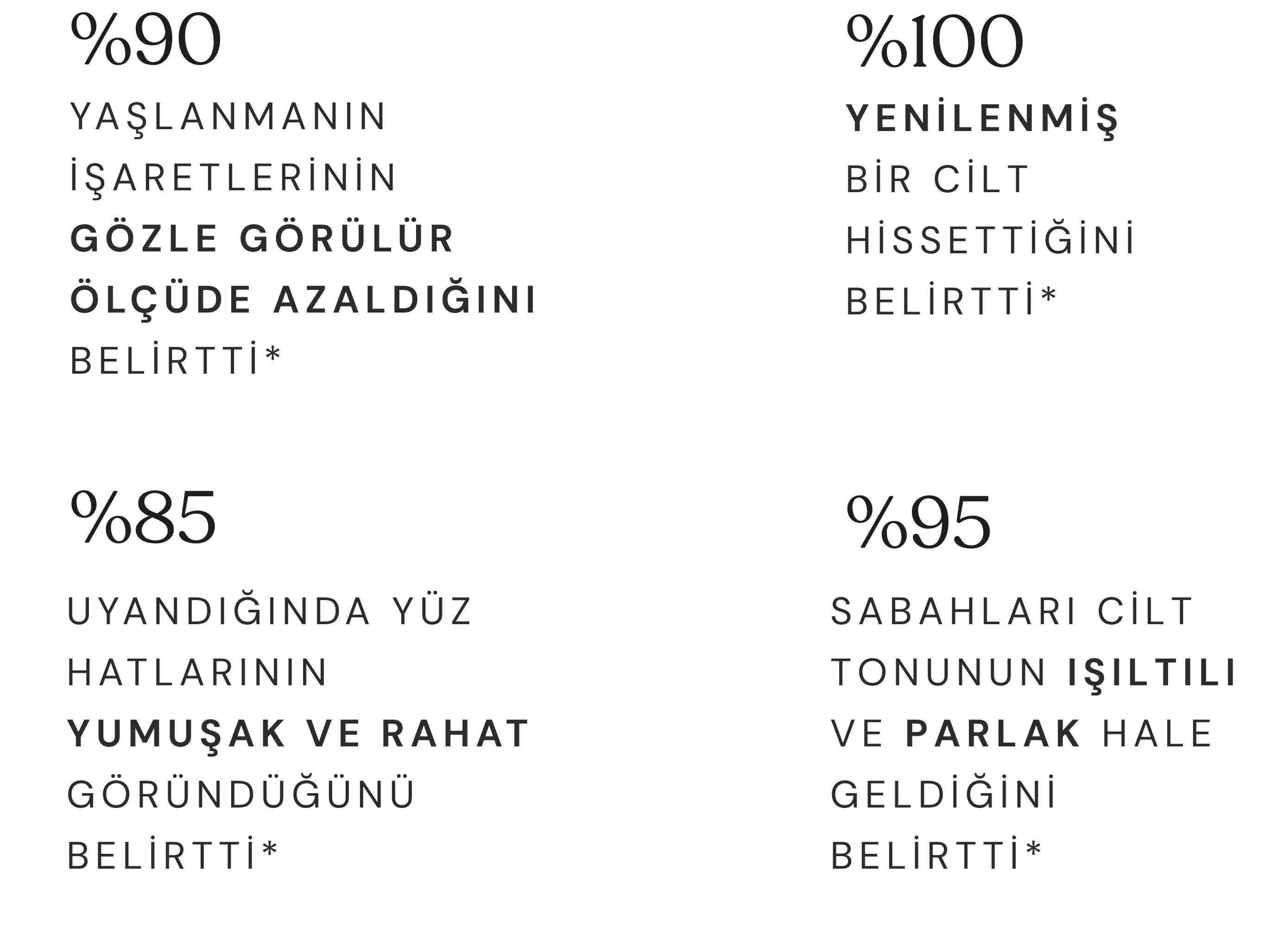 - Konfor*: Cildi gece boyunca çevresel stresin etkilerinden arındırır. Yumuşak, esnek ve rahatlamış bir cilt hissi sunar.
