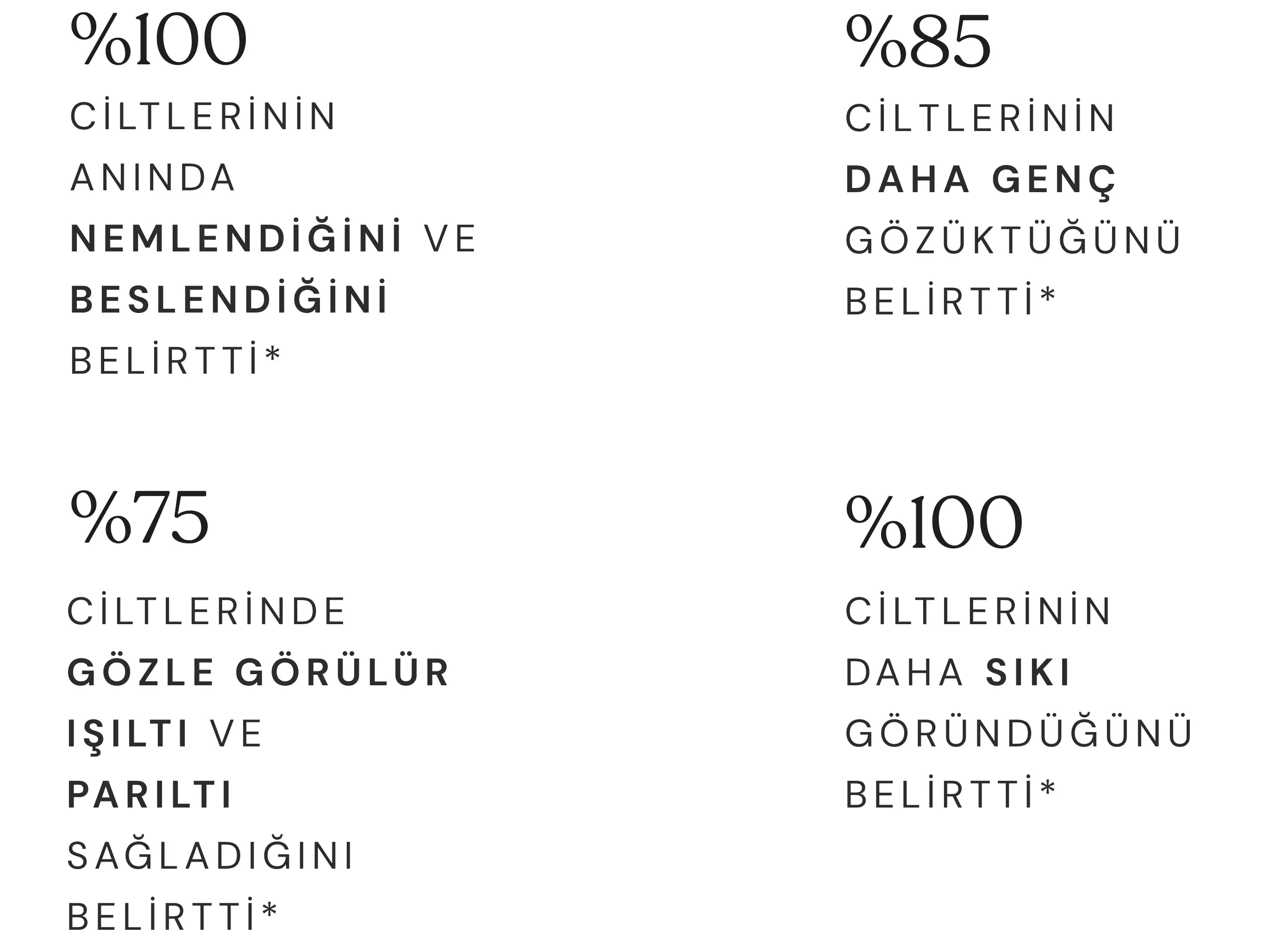 - Nemlendirir*: Cildi derinlemesine besler ve nemlendirir; yumuşak, pürüzsüz ve esnek bir doku kazandırır.